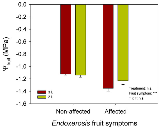 Midday fruit water potential (Ψfruit) for each irrigation system (two lines [2L] and three lines [3L]) and endoxerosis fruit symptoms (non-affected and affected) prior to the first harvest in 2019 (DOY 290). Each bar is the average of 12 measurements. Vertical error bars indicate the standard error of the mean. ‘ns’, not significant; *** indicates p < 0.001.