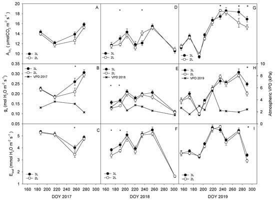 Seasonal evolution of leaf CO2 assimilation rate (ACO2, µmol CO2 m−2s−1), stomatal conductance (gs, mol H2O m−2s−1) with values of the atmospheric VPD and transpiration rate (Eleaf, mmol H2O m−2s−1) for each irrigation system (two lines [2L] and three lines [3L]) during the 2017 (A–C), 2018 (D–F) and 2019 (G–I) seasons. Each point is the average of 12 measurements. Vertical bars indicate ± SE. * indicates p < 0.05.