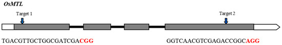 OsMTL gene structure and sgRNA target sites. Exons and introns are shown as boxes and lines, respectively. PAM motifs are highlighted in red.