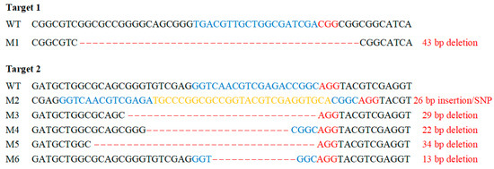 To detect mutations, fresh leaf tissue from transgenic plants (100 mg) was pulverized using a tissuelyser (Jingxin, Shanghai). The genomic DNA was extracted using the CTAB method. Amplification of the fragments flanking the two targeted sites was performed using KOD FX DNA polymerase (Toyobo, Japan) and genotyped via Hi-TOM technology [15]. The Hi-TOM primers utilized for amplification are listed in Supplementary Table S1.