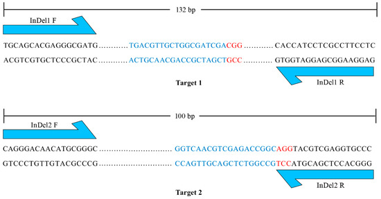 Design of specific molecular markers. The blue one-way arrows represent the sites of forward and reverse primers of the InDel markers. Targets and PAMs are indicated by blue and red letters, respectively. The dots represent the sequences between the primer and the target.
