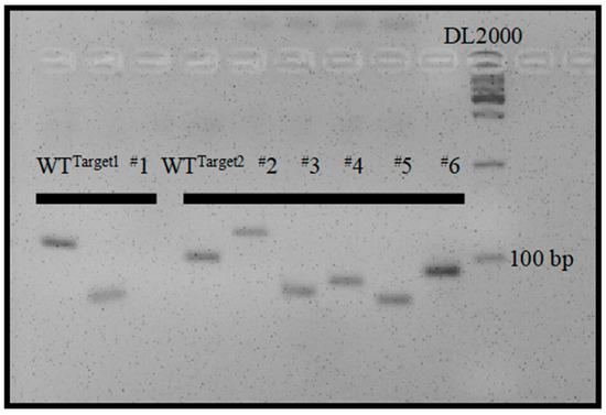 The maternal haploids produced by mtl haploid inducers exclusively harbor the genome of the female parent [4,5,6,8], while the undesired diploids contain genomes from both the male and female parents. Therefore, molecular markers developed based on sequence differences between male and female parents can be employed to identify haploids. However, the heterozygous and variable breeding materials to be made homozygous limit the application of molecular markers in haploid identification. To integrate unique and universal molecular markers into the mtl haploid inducers, we designed two pairs of primers that flank targets 1 and 2. The PCR products were 132 bp and 100 bp with reference to the normal genome (Figure 3). The large insertion or deletion mutations in the mtl haploid inducers (Figure 2) allowed the designed primers to serve as unique and universal InDel markers between the wild-type (WT) and mtl mutants. We further tested the polymorphism of the two InDel markers and found they could be easily distinguished on a 5% agarose gel (Figure 4). Therefore, we successfully integrated specific molecular markers into mtl haploid inducers.