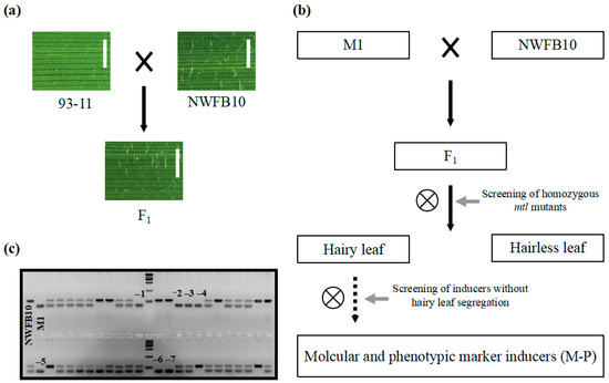 We then utilized the hairy leaf trait as a phenotypic marker to increase the efficiency of haploid identification in haploid inducers. Figure 5b displays a brief flow chart outlining the development of hairy leaf-based haploid inducers. Initially, we crossed the mtl haploid inducers with the NWFB10 variety and screened for lines exhibiting both the mtl mutation and the hairy leaf phenotype. Subsequently, we allowed the selected lines to self-fertilize and screened for lines with no hairless leaf phenotype in their progeny. We crossed the M1 haploid inducer with NWFB10 and identified seven mtl homozygous lines using the InDel1 marker in a segregating population of 46 F2 plants (Figure 5c). We harvested and grew the seeds of the seven mtl mutants separately for phenotypic analysis. Three lines, namely M-P1, M-P2, and M-P3, lacked segregation for the hairless leaf phenotype in their progeny and were therefore identified as phenotypic marker-based haploid inducers with both InDel and hairy leaf markers.
