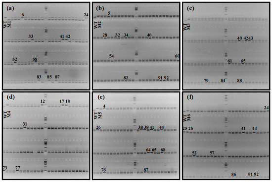 Polymorphism analysis of InDel1 and InDel2 markers in 5% agarose gel. The homozygous mutants of M1, M2, M3, M4, M5, and M6 from the T1 generation were used for analysis.