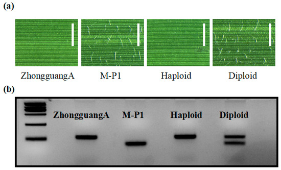 Identification of haploids using the hairy leaf marker. (a) Adaxial leaf epidermis morphology of ZhongguangA, M-P1, haploid, and diploid observed under light microscopy. Bar = 1 mm. (b) Polymorphism analysis of ZhongguangA, M-P1, haploid, and diploid was conducted using the InDel1 marker. The results were visualized in a 5% agarose gel. Marker = 2000 bp.