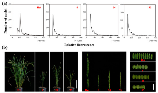 (a) Ploidy analysis of heterozygous diploid plant (Het) and haploid lines (6, 24, and 33) by flow cytometry. (b) Whole plants, panicles. and glumes of heterozygous diploid plant (Het) and haploid lines (6, 24, and 33). Bars = 20 cm (left), 3 cm (middle), and 2 cm (right).