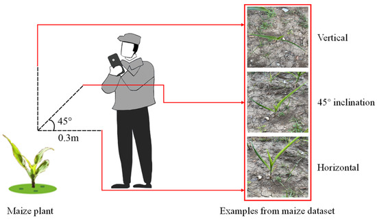 This study focused on recognizing the growth stages of maize, which aimed at growth status monitoring and precision irrigation conducted in smart agriculture. All images used in this study were acquired from Nongcuiyuan Experimental Station in Anhui Agricultural University, which were photographed between 7:30–17:30 from 10 September to 28 October 2021. The experimental station was set up with different cultivars, namely Zhengdan 958, Nongda 108, Jinhai No. 5 and Denghai 3662, each planted in separate plots. In each plot, the maize plants were arranged in six rows with a row spacing of 60 cm and a within-row plant spacing of 25 cm. The planting density was 65,000 plants per hectare. Other field management measures were implemented in accordance with local standards. During image collection, maize samples were randomly selected from the experimental field and captured from one or more of the following angles: horizontal, 45° inclination and vertical for each individual plant. To be more specific, Figure 1 shows the schematic diagram of the image collection process in this study. The experimenter stood at a distance of 0.5 m from the same maize plant and used a mobile phone (HUAWEI or iPhone) to photograph it from three angles: horizontal, 45° inclination and vertical. The phone was about 0.3 m away from the maize plant. This distance was employed to ensure that each image contained a clear maize plant. Furthermore, this employed distance can help in avoiding the incident of damaging the maize plant by the experimenter during data collection.
