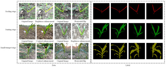 Data augmentation is a proven approach to constructing a robust deep-learning model. [46,47]. In the field of smart agriculture, researchers often use geometric transformation and pixel intensity shift (color shift) for data augmentation [48,49,50]. As shown in Figure 2, data augmentation processes were randomly performed by horizontal flip, contrast enhancement and brightness enhancement to all 450 images for simulating the effects of different weather and light intensities, with the aim of improving the robustness and the generalization ability of the recognition model. Additionally, the data augmentation method utilized in this study can effectively augment the dataset with minimal cost. The reason for this is that by simply flipping the label horizontally or leaving it unchanged, we are able to generate the corresponding label for generated images. As a result, the number of images was expanded to 900 by means of the aforementioned data augmentation operation. Subsequently, all images were randomly divided into 70%, 20% and 10% as the training set (630 images), validation set (180 images) and test set (90 images). Finally, the maize dataset was generated according to the PASCAL VOC 2012 format.