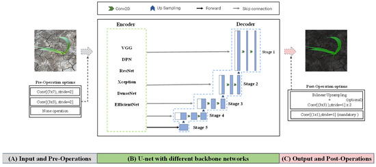 ResNet, DPN, DenseNet and Xception, EfficientNet used 7 × 7 convolution operation and 3 × 3 convolution operation for the first down-sampling. Therefore, as shown in part (A) of Figure 3, we defined the first down-sampling operation of these five backbone networks as Pre-Operation, including three options. To achieve consistency between the input and output feature map resolutions, we introduced a Post-Operation step in part (C) of our approach. Specifically, this step adjusts the feature map resolution following the decoder output of the U-net [53]. The Post-Operation step contained two options; the final feature vector mapping was mandatory, but the other one was optional. When the number of down-sampling operations of the backbone network was greater than four, the Post-Operation part used bilinear up-sampling and double 3 × 3 convolution operations, which was similar to the decoder of the U-net, restoring the resolution of the feature map to 512 × 512. At the mandatory option of the Post-Operation part, a 1 × 1 convolution was employed to map feature vector to four [54], which indicated the seedling stage, jointing stage, small trumpet stage and background in this study. The U-net architecture, depicted in Part (B), omits the Pre-Operation and divides the remaining backbone network into five Encoder-Blocks based on four max pooling operations [55]. As a result, backbone networks were able to be employed as the encoder for enhancing the feature extraction ability of the original U-net. In summary, the proposed strategy in this study could allow the feature maps generated by each stage in backbone networks to be concatenated with the corresponding decoder stage using a skip connection. As a consequence, all of the aforementioned six different backbone networks were adapted to the U-net and did not change the original U-net structure.