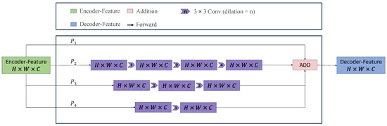 We constructed the dilation path to connect the encoder part and the decoder part and the structure, as shown in Figure 5. The dilation path composited of four sub-paths, from top to bottom, named {P1, P2, P3, P4}, and each path consists of stacked dilated convolution layers with different dilation rates. The dilation rates of the top path were set to 1, 2 and 4, respectively. From top to bottom path, the number of dilated convolution layers decreased sequentially, causing the receptive field of each path to be different. Therefore, the semantic segmentation model could combine features from different scales by adding results of all paths. In this way, the receptive field was increased by cascading dilated convolution layers, and the advantage of multi-resolution features was taken by the parallel mode of the dilation path.