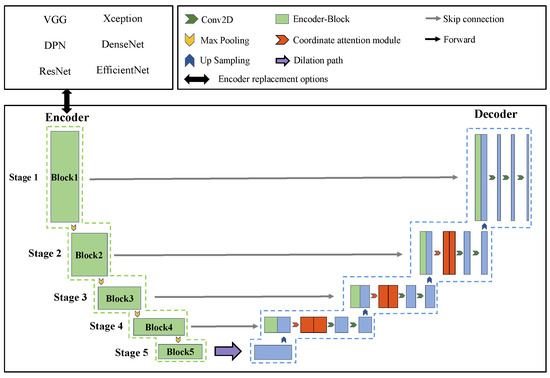 Previous studies showed that many backbone networks, such as VGG, Xception, DPN, DenseNet, ResNet and EfficientNet, were worth considering for the task in this paper [26,27,28,29,30,33]. However, the U-net architecture offered a unique property (i.e., skip connections), which set it apart from other encoder-decoder models. At each spatial resolution level of the U-net model, the skip connection copies the activation outputs to the same resolution level in the decoder [28]. Therefore, the number of skip connections was equal to the number of down-sampling and up-sampling. As we know, U-net had four skip connections, corresponding to four pairs of up-sampling and down-sampling operations. This means that each backbone network needed to be divided into five stages according to the down-sampling operation for fitting into U-net. However, ResNet, DenseNet, EfficientNet, Xception and DPN had five down-sampling operations; the division according to the down-sampling operations might result in six stages. Therefore, these aforementioned backbone networks faced a common problem, which led to the inability to be directly used as feature extraction networks of the original U-net.