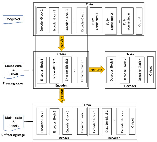 As shown in Figure 7, the training process was divided into two stages: the freezing stage and the unfreezing stage. The backbone networks were pre-trained on the ImageNet dataset to achieve a relatively optimal parameter space. In this study, representative hyperparameters batch size, learning rate and epoch were considered when training the improved U-net. In the freezing stage, all parameters of the backbone network were frozen, and the decoder of the improved U-net was trained. Adjusting fewer model parameters in the freezing stage and the learning rate was set slightly larger to jump out of the optimal local solution. Therefore, the learning rate was set to 1 × 10−4. The batch size of training was set to 4, and epochs were set to 100. In the unfreezing stage, all parameters of the backbone networks were unfrozen and participated in training. The learning rate was set smaller to ensure the stability of the model training. The learning rate of the unfreezing stage was set to 1 × 10−5, and other parameters were the same as in the freezing stage. In this way, pre-trained backbone networks could be better adapted to maize datasets for potentially achieving good performance and reducing the data demand.