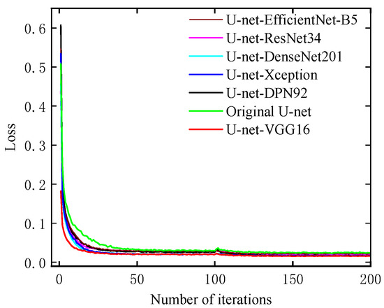 To improve the feature extraction ability of the original U-net, the replacement strategy (see Section 2.3.2) was used to employ different backbone networks and the training results of U-net-VGG16, U-net-DenseNet, U-net-DPN92, U-net-EfficientNet-B5, U-net-ResNet34, U-net-Xception and the original U-net were compared. The training set was applied to conduct the training of maize growth stage recognition based on the above network architectures. Additionally, the test set of 90 images was used to assess the performance of the different backbone network architectures.