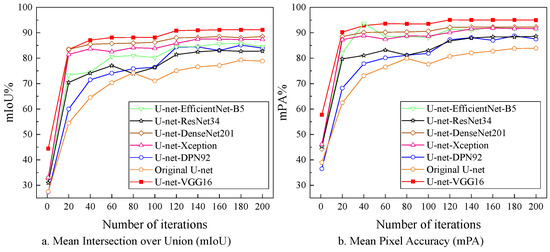 Subsequently, the models were verified once every 20 iterations during training and the validation results of the different encoders were analyzed, as shown in Figure 9. In general, significant improvement of the mIoU and mPA among the encoders was found. It could be seen that the U-net-ResNet34, U-net-DPN92 and original U-net generally kept an upward trend until the peak was reached, in spite of some small fluctuations. For the rest of the encoders, the trend of mIoU and mPA curves was almost identical. Specifically, with the increase of training iterations, the mIoU and mPA gradually increased. The U-net-VGG16 model exhibited exceptional performance in terms of mIoU. However, it is important to acknowledge that U-net-EfficientNet-B5 outperformed U-net-VGG16 in terms of mPA at 40 iterations. This discrepancy can be attributed to the limited number of training iterations, which resulted in the instability of the training weights. Nonetheless, it is crucial to recognize the overall advantages of U-net-VGG16, as this minor deviation should not overshadow its strengths. As a result, the U-net-VGG16 model exhibited the highest performance in terms of mPA among the backbone networks. This finding further underscored the advantage of employing cascade convolution in the recognition of the maize growth stage.