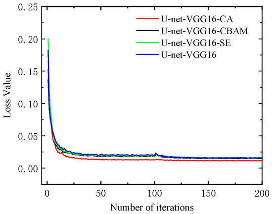 Based on the U-net-VGG16 model employed by the backbone network replacement strategy, a comparative experiment was conducted to assess the performance of maize growth stage recognition models using different attention mechanisms (CA, CBAM and SE). In this study, we embedded attention mechanisms after skipping the connection of stages 2, 3 and 4 of the decoder and analyzed its impact on the recognition results. The trends of training loss over 200 epochs for all three attention blocks are illustrated in Figure 10. As inferred from Figure 10, the loss values decreased as the number of epochs increased and were generally stable when the number of epochs reached 25, which indicated that all models achieved low loss values in the training phase. Note that the loss of the U-net-VGG16-CA network was the lowest among all three attention blocks, and the model quickly reached its optimum point.