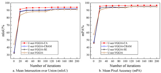 In this study, three standard semantic segmentation metrics were used to evaluate the segmentation results [61]. The overall intersection over union (IoU), mIoU, pixel accuracy (PA) and mPA were used to assess and compare the segmentation performance (Equations (3)–(6)). The IoU and PA were averaged over all images in the test set to obtain mIoU and mPA, respectively. Intuitively, the mIoU calculates the degree of spatial alignment between segmentation results and ground truth, while the mPA measures the number of correctly classified pixels relative to the total number of pixels [51]. The model parameters were also measured to assess the complexity of segmentation network.