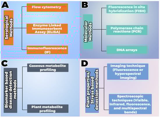 Available methods for plant disease detection: (A,B) direct methods and (C,D) indirect methods []. Direct methods include traditional, serological, and molecular methods, while indirect methods include biomarker-based approaches such as metabolite profiling from plant pathogens and plant interactions and stress-based approaches such as remote sensing using drones.