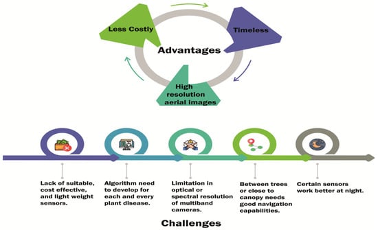 Drones equipped with sensors can measure spectral and morphological information such as plant height and canopy surface profiling. The advantages and disadvantages of drone utilization in agriculture are presented in Figure 2. Moreover, at high altitudes the captured images usually have low spatial resolution, making it difficult to detect features of disease lesions at the level of plant organs, even though super-resolution methods have recently been developed that can produce a high-resolution image from one or more low-resolution images [] (Figure 2).