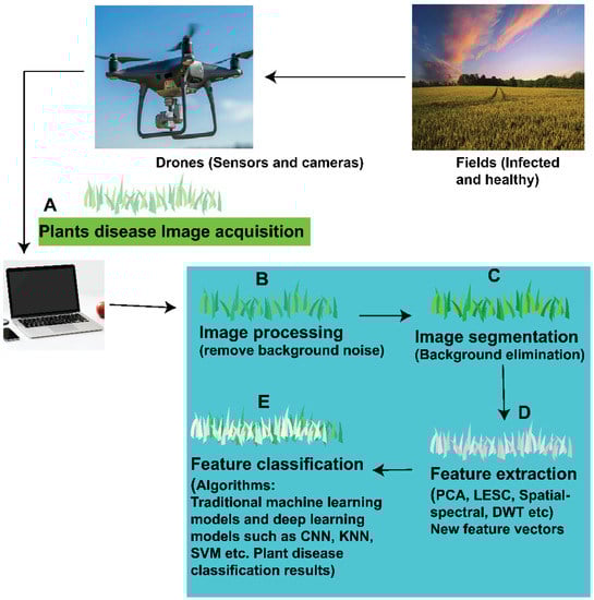 Plant diseases are responsible for enormous yield losses and for threatening global food production []; hence, proper detection and reliable diagnostic methods for identifying the etiological agents of disease are essential to conserving time and money by preventing or limiting crop damages []. Classically, diseases were recognized based on traditional methods; these methods, often subjective, were strictly dependent on the observer and though time-consuming overall, were prone to inaccuracy. Additionally, human scouting is expensive and, in many cases, impractical due to human error and/or the occurrence of cryptic when not mild symptoms, making diagnosis at early stages impossible []. Therefore, a technologically driven agricultural revolution is important to permanently solve the problems mentioned earlier at a reasonable cost with little environmental impact. With the continuous adoption of recent advanced technologies such as Internet of Things devices, intelligent algorithms, sophisticated sensors, and modern machines, agriculture has changed. It is currently changing from being accomplished by human workers to using smart agricultural machines and robots. Smart agricultural machines and robots have been developed which detect plant diseases early on and at the same time monitor their long-distance movement [,]. Many researchers have used high-resolution imagery collected from satellites, airplanes, on-the-ground machines, and drones to identify agricultural diseases. Satellites and airplanes can cover vast areas in a short amount of time. However, satellites and airplanes have poor spatial and temporal image resolutions compared to drones and are highly susceptible to weather conditions that can affect overflight [,,].