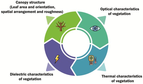 Plant morphological information is acquired through two main methods: LiDAR (Light Detection and Ranging) [] and Structure-from-Motion (SfM) photogrammetry. LiDAR calculates the distance from the sensor to ground objects to measure their position; its beams can pass through the crop canopy and send back information about its structure, plant density, and the ground surface. SfM photogrammetry collects images from multiple perspectives as drones fly over the fields; it utilizes high-resolution digital cameras from which images can be used to measure such phenotypical characteristics of the plant population as individual height, lodging, developmental stages, and yield. The spectral reflectance or radiance is an important indicator for the detection of plant vigour, plant diseases, and soil properties [,]. Multispectral (usually from 3 to 6 spectral bands, from 0.4 to 1.0 μm) and thermal cameras (commonly in the 7–14 μm range) aboard drones can detect diseases in the fields, monitor crop vigour, estimate biomass and yield, and detect symptoms of both abiotic and biotic stresses. Digital cameras can detect one or a few broad near-infrared (NIR) bands [], while hyperspectral cameras (tens to hundreds of spectral bands) measure narrow bands; despite having been reduced for drone utilization, the latter require extra space and payload capacity [,,] (Table 3).
