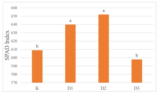 The value of the leaf greenness index SPAD for the plants from the experimental treatments studied differed significantly between the K and D3 treatments and the D1 and D2 treatments (Figure 1). The application of apple pomace addition to the soil had a beneficial effect on the SPAD value, with a higher value found in plants from treatment D2 compared to D1, but this was not a statistically significant difference. A higher dose of apple pomace had a lower effect on the SPAD index in plants at site D3 compared to K, but this was not a significant difference. The SPAD index is one tool to determine the nitrogen supply of plants []. Apple pomace also contains a certain amount of nitrogen, which can further enrich the available pool of this element in the soil for plants. Apple pomace has a rather diverse composition due to many factors influencing it, such as apple cultivar. According to a study by Krasowska and Kowczyk-Sadowy [], it can contain between 0.5–1.2% nitrogen in wet weight. The use of equal mineral nitrogen fertilisation in our study and the higher SPAD index may indicate the introduction of an additional dose of nitrogen from pomace used by the plants. The study by Ukalska-Jaruga et al. [] confirm that an appropriate choice of organic matter source and fertilisation increased the amount of assimilable nitrogen in the soil, thus conditioning the quality of wheat yields. The negative effect of the highest level of pomace applied on the D3 site on the SPAD index may have been due to significant soil acidification and hindered nitrogen uptake by plants due to a less developed root system. According to a study by Krasowska and Kowczyk-Sadowy [], apple pomace is one of the waste materials which, due to its low pH (in the range of 3.7–4.3), can have a strongly acidifying effect on soil.