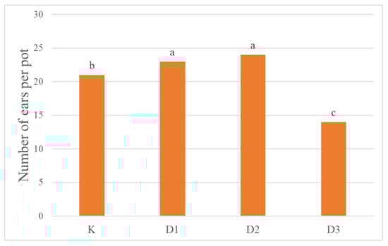 Average number of ears per pot depending on the level of apple pomace addition to the soil. Different letters (a–c) are significantly different (α = 0.05).