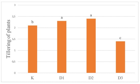 Average plant number tillering as a function of the level of apple pomace addition to the soil. Different letters (a–c) are significantly different (α = 0.05).