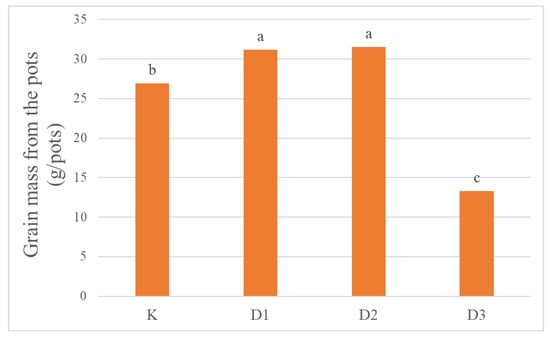 Average mass of grains per pot (g) as a function of the level of addition of apple pomace to the soil. Different letters (a–c) are significantly different (α = 0.05).