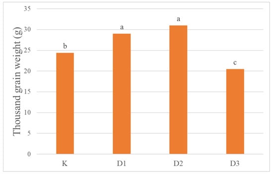 The addition of apple pomace to the soil on treatments D1 and D2 resulted in a significant increase in the number of ears compared to the control treatment (K). However, the increased dose of pomace applied on the D3 treatment had a negative effect on the number of ears, and this was a significant difference from both the control treatment and the D1 and D2 treatments (Figure 2). Tillering has a very strong influence on wheat yields because the number of ears per plant depends on it. The tillering process is influenced by many factors, both environmental and the varietal factor itself []. The higher number of ears was due to the higher tillering of the plants in sites D1 and D2 (Figure 3). The average tillering in them was 2.3 and 2.4 shoots per plant, respectively, and this was a significant difference from the control treatment, with 2.1 shoots, and the D3 treatment, with 1.4 shoots. A positive effect of the addition of apple pomace to the soil was also found in the weight of grains per ear on the D2 treatment, and this was a statistically significant difference with respect to the other treatments (K, D1 and D3) (Figure 3). Production bushiness, number of ears, and grain weight per ear are the main determinants of yield []. The higher number of ears and number of grains per ear also influenced the higher grain weight per spike at sites D1 and D2 compared to the other experimental sites (Figure 4). The lowest grain weight per pot was found for treatment D3 (Figure 5). A similar relationship was found for thousand-grain weight, where D1 and D2 treatments showed significantly higher thousand-grain weights than K and D3 (Figure 6). A difference in thousand-kernel weight was found between treatments D1 and D2, being higher on treatment D2, but this difference was not confirmed statistically. The application of a higher addition of apple pomace to the soil had a negative effect on the weight of one thousand grains, which was confirmed by a statistically significant difference from the control treatment. Ukalska-Jaruga et al. [] also confirm that the application of an adequate dose of organic matter can influence higher grain weight and yield.