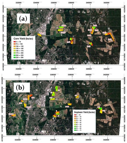 Beltsville Agricultural Research Center (BARC) in Beltsville, Maryland showing average (a) maize yield and (b) soybean yields for our study fields for 2017–2020 from yield monitor system. The text beside the field represents the field name.