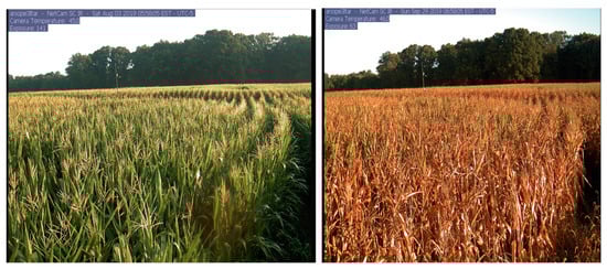 Phenocam images showing maize at R1 (anthesis) and R6 (maturity) stages in 2019 at field 5-3AB (labeled in Figure 1a).