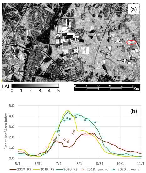 PlanetScope-based LAI over BARC on 1 August 2020 (a) and LAI time series for the field 6-60 (old airport converted field, red circle in LAI map) from 2018 to 2020 (b). LAI ground measurements (points) from 2018 and 2020 (b) generally followed the LAI time series trend at the field level. In plot (a), the PlanetScope-based LAI map is scaled from 0 to 5 using a grayscale ramp.