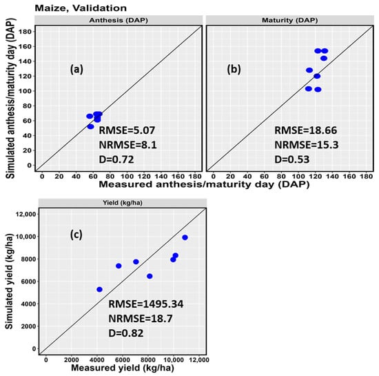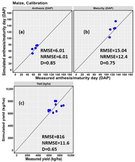 Table 3 and Figure 4 present the results for flowering and physiological maturity dates, and for the final grain yield of maize for the calibration dataset for 10 site years at BARC. The results are within 9.6 to 12% NRMSE of observations, which indicates that the calibrated model was able to estimate phenology and grain yield reasonably well for most of the fields analyzed. The Willmott’s statistics show a good agreement between the simulated and the observed yield (0.65 to 0.85). The results of the RMSE are reasonably low, especially for the flowering and grain yield of maize at BARC. These results demonstrated that remotely sensed derived parameters can be used to augment field observations, especially in data-poor regions. Additionally, these results are consistent with the conclusion of previous studies that integrating remote sensing with field observations as inputs to crop growth models provides an effective solution for assessing crop growth conditions and yield in data-poor regions [18,19,20,40].