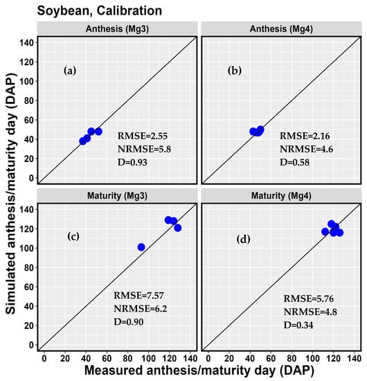 The results of the simulated versus measured (a,b) flowering (R1) and (c,d) physiological maturity (R7) for soybean maturity groups 3 (Mg3) and 4 (Mg4) at BARC. DAP = day after planting, Mg = maturity group. Straight-line represent 1:1 line.