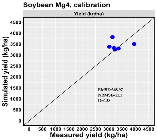 The results of the simulated versus measured yield for soybean maturity group 4 at BARC. Straight-line represent 1:1 line.