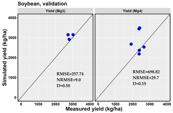 For the soybean maturity groups 3 and 4, Table 4 and Table 5 and Figure 5 and Figure 6 show the results of phenology (days to flowering and maturity) and yield for the calibration dataset for 4 site years (note, only one year of yield was available for maturity group three). The NRMSE ranged from 5 and 7%, indicating an excellent result for the phenology. This indicates that the calibrated model was able to estimate phenology reasonably well. However, the results of the Willmott’s statistics (d index) show a very good, calibrated model of soybean phenology for maturity group three but not for maturity group 4. Yield data for three out of the four fields planted in soybean maturity group three were not available; however, the field with available yield data showed an absolute deviation of 6.6%, which is very good. For the maturity group four, the model-simulated yield for the six calibrated fields did reasonably well (NRMSE of 16%).