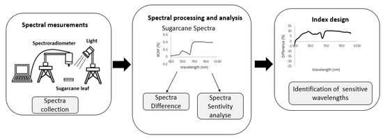 The vegetation indices were designed considering the following steps: spectral analysis of sugarcane leaves, a field study to acquire hyperspectral images using an unmanned aerial vehicle (UAV), processing hyperspectral images, and the application of vegetation index in hyperspectral images.