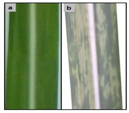 (a) Healthy leaf of sugarcane cultivar. (b) Leaf infected with mosaic virus.