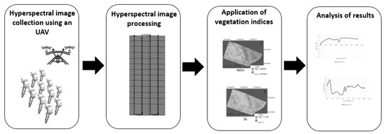 Flowchart of the index’s evaluation process. The main steps include hyperspectral image collection using UAV, hyperpesctral image processing, application of vegetation indices and analysis of results.