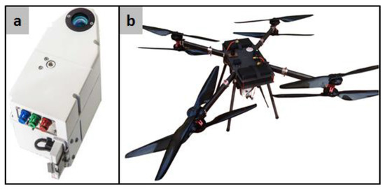 (a) Rikola hyperspectral camera, (b) multirotor UAV model SX8.