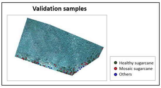 Field samples of diseased sugarcane and other classes, including samples of healthy sugarcane, bare soil, and weeds, were used. In the accuracy analysis, 80 sample points selected in the field were used (35 samples of healthy, 35 samples of sugarcane infected with mosaic, and 10 samples of others). Figure 6 shows the spatial distribution of plants inspected in the sugarcane crop. Due to access limitations resulting from the high density of the sugarcane crop, it was only possible to check areas close to the edges.