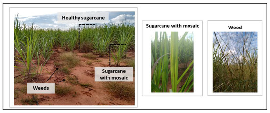 At the crop, it was also possible to verify the presence of weeds and some areas with failures in the plantation line. Figure 7 shows an example of the plants infected with the mosaic virus. Note that diseased plants were smaller than healthy plants.