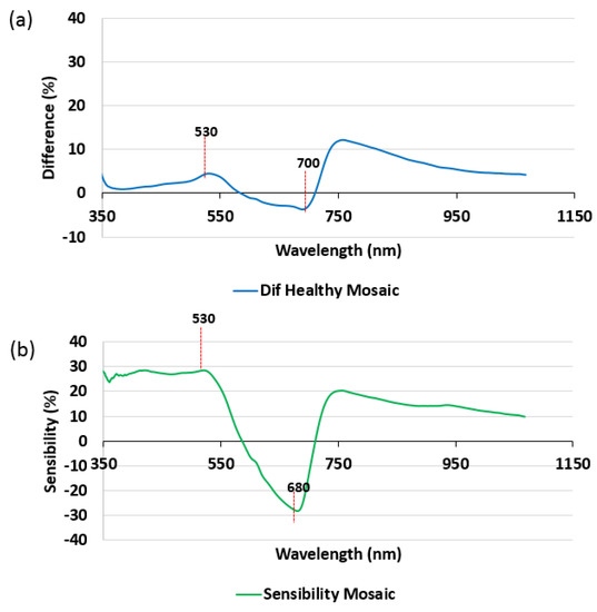 To identify sensitive spectral regions that could distinguish the healthy and diseased leaf, differences were calculated between the spectra of each kind of leaf, resulting in a spectral difference based on Carter [34]. For the sample of leaves, reflectance differences were calculated by subtracting the mean leaf reflectance of a healthy leaf from that leaf infected by mosaic at each wavelength. The average spectra of the two study cases were used in this analysis. Thus, healthy leaves were compared to the leaves infected by mosaic.