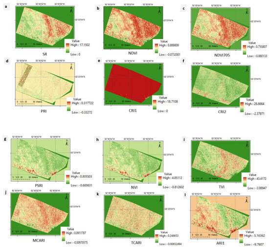 The relationships between anthocyanin, stress and senescence are important indicators for some types of vegetation [21,22,23,24]. In addition, the 530 nm is a wavelength that can be an element of an index, as proposed by Gitelson [21], who used the 550 nm wavelength. Chlorophyll a concentration changes when plants are subjected to stress. Many of these indices are based on the change in plant pigment concentration. Changes in the plant structure can occur both in the red edge position and in the NIR region in some situations. Thus, it is clear from these previous studies that vegetation indices may identify plant responses under stress.