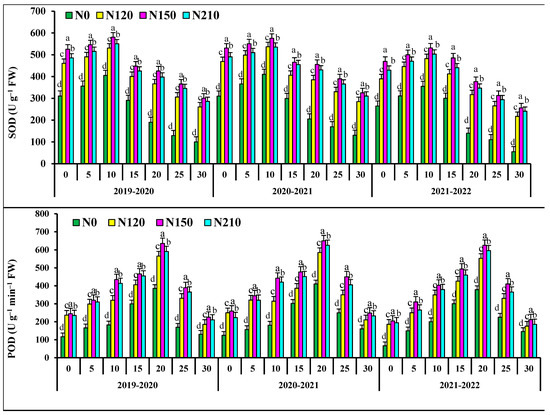 At 0–15 days after anthesis, the activities of superoxide dismutase activities (SOD), peroxidase (POD), and soluble protein in flag leaves of N0 and N120 had no significant differences with those of N150 (Figure 2). At 20–30 days after anthesis, the activities of superoxide dismutase (SOD), peroxidase (POD), and soluble protein in flag leaves of N150 were significantly higher than those of N210, respectively. At 0–10 days after anthesis, the catalase (CAT) in flag leaves of N0 and N120 wheat showed no significant difference, but at 15–30 days after anthesis, the catalase (CAT) in N150 was significant. N150 the superoxide dismutase (SOD) activity, peroxidase (POD) activity table, soluble protein and catalase (CAT) in flag leaves of wheat increased first and then decreased. In the two wheat growing seasons, malondialdehyde (MDA) in the flag leaf of wheat after anthesis increased and then decreased with the progress of grouting. At 0–15 days after anthesis, there was no significant difference in malondialdehyde (MDA) in flag leaves of N0 wheat. At 20–30 days after anthesis, the POD activity of N150 was significantly lower than that of 210. The malondialdehyde (MDA) of wheat flag leaves decreased with the increase in nitrogen application rate. The activities of superoxide dismutase (SOD) and peroxidase (POD) and soluble protein and catalase (CAT) in the kernel flag leaf of wheat after anthesis first increased and then decreased with the progress of grout.