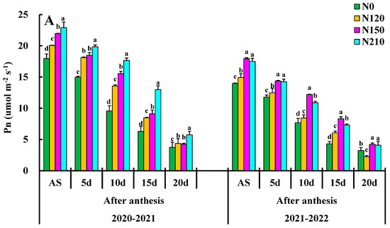 Effects of different N rate comparisons of stomatal conductance gs are shown in Figure 3B. The 20–30 day, N150 was the highest, reaching 0.45 followed by 20–30 day, N210, and 10–20 day N150. The gs value was highest in the N150 compared to other treatments, and there was a significant difference between N0 and N120 treatments. There was a significant difference between treatments N120 and N150. However, there was a significant difference between N210. N150 had very significant effects on gs at each growth stage, but only N150 had a very significant interaction in the days after anthesis.