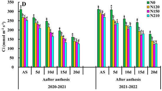 The effects of different nitrogen applications and the influence of the Ci winter wheat flag leaves are shown in Figure 3D. The maximum Ci value of days was 505.28 Ci (μmol (CO2) mol−1) with the increased nitrogen application rate, and the Ci value decreased significantly. The Ci value of 10–20 d, N120 treatment at the days after anthesis, and N0 treatment might be due to the high nitrogen level. Environmental stress on the flag leaf causes the stomata to close on the wheat flag leaf, increasing Ci. The N0 at days after the anthesis of growth had significant effects on the Ci winter wheat flag leaf, and the interaction between these two interactions was extremely significant days after the anthesis.
