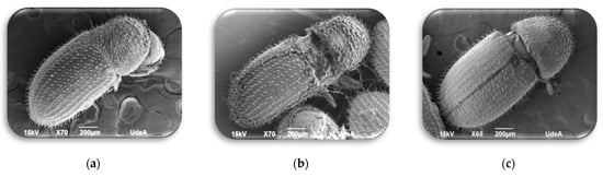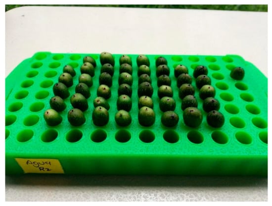 To evaluate curative effects, coffee fruits were disinfected []. Groups of 90 fruits were placed in 16.5 × 11 × 7 cm methacrylate boxes with a lid, and 120 disinfected adult insects were added to these boxes [].