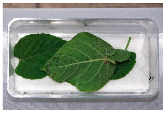 Sixty insects, nymphs and adults of M. velezangeli, were separated into groups of three insects, which were placed in 7.5 cm tall × 21.5 cm long × 10 cm wide rectangular boxes containing a wet napkin at the base and Cissus verticillata stems with leaves. Each box was an experimental unit (Figure 2). The treatments were sprayed with a Preval® spray sprinkler, with application to the insects and the substrate. Ten experimental units with three insects (thirty insects total) per treatment were evaluated. After spraying, the boxes were incubated under controlled conditions at a 20 °C temperature, an 80–90% relative humidity, and a 12 h photoperiod.