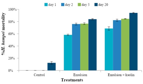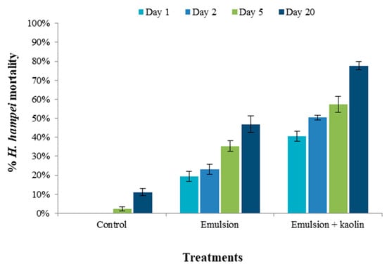 In this experiment, the effect of the emulsions on CBB when applied to the coffee fruits was observed after 24 h, and the mortality increased over the observed days (Figure 3). The two emulsions (Table 1) caused high insect mortality (84%) on day 20 (Table 3) and showed significant differences compared to the control with water (ANOVA, F = 453.48, DF = 2.24, p < 0.0001). According to the LSD test, the addition of kaolin potentiated the effect of the emulsion, resulting in a higher (94%) mortality (p < 0.001) in this treatment.